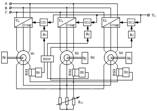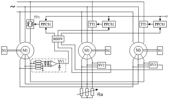 Here, M1, M2, and M3 are the asynchronous motors with a phase rotor; N1, N2, and N3 are the motor shaft loads; SV1, SV2, and SV3 are the rotary voltage sensors’ EMF; TT1, TT2, and TT3 represent the back-to-back thyristors; BDDW is the block for determining the degree of the workload; PPCS1, PPCS2, and PPCS3 are the pulse-phase control systems; and Ra is the total rotor resistance EOS.