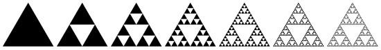 The Sierpinski set has already been explored for cryptographical purposes [18]. It is constructed starting from an equilateral triangle. It is divided into four congruent triangles, and then the central one is eliminated. The procedure is repeated infinitely with the remaining triangles (see Figure 2).