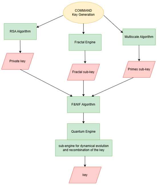 The purpose of this work was to develop a new cryptographic algorithm starting from our work in [1]. With respect to the algorithm in [1], we extended the number of fractals, we introduced a sub-algorithm for the choice of fractals that was random and rolling, and then we introduced a new multiscale sieve for prime generation, but the most relevant addition was the introduction of a sub-engine, which introduced two quantum properties useful for its crypto-agility, that is, quantum evolution of the key and quantum recombination. The NIST tests on the cryptographic key confirmed in all cases the randomness of the latter; this was also true for the new fractals added, Barnsley and Vicsek. Consequently, with the quantum security technique, an additional level of security is guaranteed by further varying the position of the components of the key and making it more resistant to the possibility of violation via quantum attack. This makes the security key applicable in the context of cryptography of the next generation.