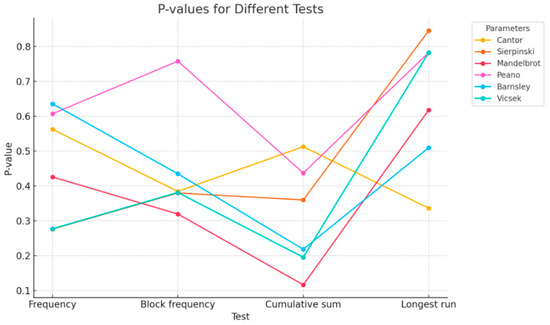 In all the tests run, all the p-values of the parameters were greater than 0.01, and this indicated the cryptographic key is actually random. In Table 1, the p-values obtained from the tests performed for each fractal are reported.