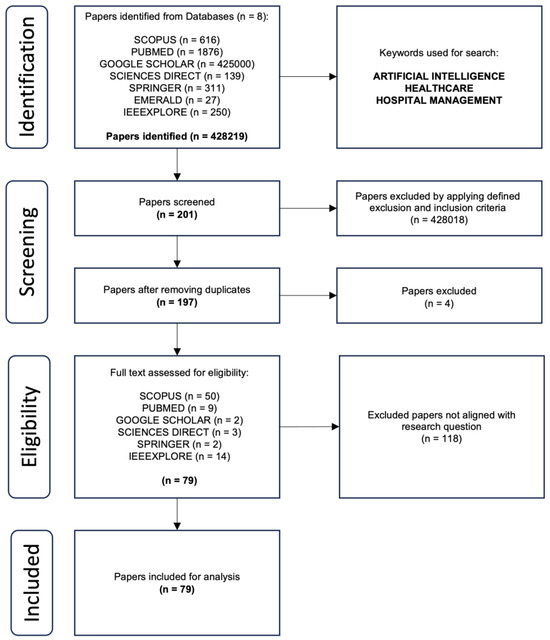 As shown in Figure 1, 79 articles out of 428,219 were included in this study. The reduction was achieved through a rigorous screening and selection process based on specific inclusion and exclusion criteria. Initially, 428,018 articles were removed by applying the established inclusion and exclusion criteria, resulting in 201 articles. Next, 4 duplicates were identified and excluded, resulting in 197 unique articles. These articles were then subjected to a thorough review, excluding 118 articles deemed not aligned with the research question. The remaining 79 articles were further screened by subjecting them to a comprehensive review and deemed suitable to provide substantive insights into the influence and role of AI for healthcare management. These methodological steps made it possible to conduct a focused and thorough systematic review on the influence of AI on healthcare management, providing a solid basis for understanding the current state of research and prospects in this dynamic and rapidly evolving field.