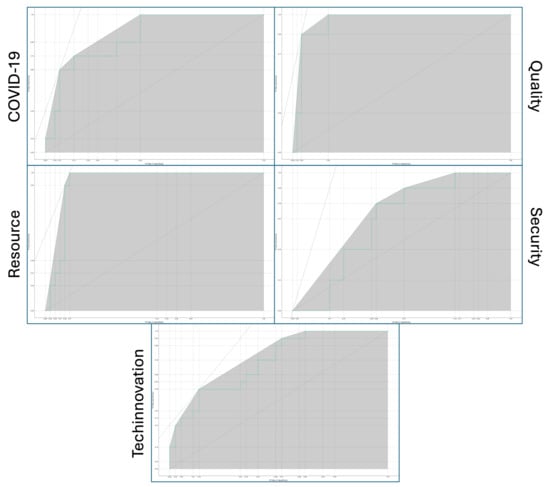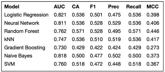 By employing a dual-validation approach, combining data sampling with 70% for training and 30% for testing, alongside a 10-fold cross-validation, we rigorously assessed machine-learning predictive models including logistic regression, Neural Networks, Naive Bayes, Random Forest, SVM, Gradient Boosting, and kNN. This method provided a reliable estimate of model performance, identifying logistic regression as the most effective based on key metrics [108]. The relevance of such machine-learning techniques in deriving relevant insights and predictive frameworks from complex data sets has been previously highlighted and confirmed in analogous research within the realm of hospital facility efficiency analysis, public health efficacy, and the resulting patient health mobility [109,110,111]. logistic regression demonstrated an AUC of 0.821, showcasing its effectiveness in healthcare management analysis. These findings, depicted in Figure 2, offer a solid foundation for the informed selection of the most suitable predictive model for analyzing AI’s impact on healthcare management. The AUC was chosen as the primary metric due to its ability to provide a comprehensive measure of model performance across all classification thresholds, offering a balanced evaluation of both sensitivity and specificity.