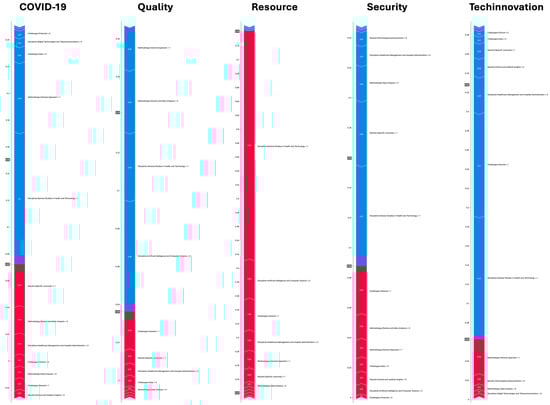 AI for quality assurance and stakeholder engagement (QUALITY) emphasizes the importance of maintaining high standards of care and actively involving all healthcare sector stakeholders in the digitalization process. This aspect is crucial to ensure that technological innovations genuinely enhance patient care and are embraced by doctors, patients, and other healthcare professionals. AI in the healthcare response to the COVID-19 pandemic (COVID-19) has shown how advanced technologies can be swiftly employed to address global health emergencies, offering tools for diagnosis, contact tracing, and hospital resource management. This has highlighted AI as an essential tool in combating pandemics and other health crises. Technological innovations and AI in enhancing healthcare (TECHINNOVATION) reflect the sector’s ongoing evolution, where AI contributes to pushing the boundaries of medicine, from discovering new treatments to personalizing care. This thematic area highlights AI’s role in accelerating innovation and improving operational efficiency. Security and smart platforms (SECURITY) focus on the need to protect sensitive patient data and ensure the safety of implemented AI systems. The increasing integration of AI raises privacy and security issues that must be addressed to maintain user trust and comply with regulations. Lastly, AI and resource management in healthcare (RESOURCE) shed light on how AI can contribute to more efficient resource use, both in terms of costs and environmental sustainability. Optimizing resource management is vital to address the sector’s future challenges, including the growing demand for services.
