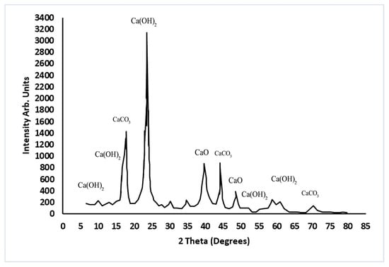 To produce cement–lime mortar, high calcium hydraulic lime according to ASTM C141 [21] was used as a binder and as a partial replacement for cement. In this investigation, the percentage of lime utilized was 0, 15, 25, 35, and 50% by weight of cement. The physical and chemical properties of the used lime are presented in Table 2. The data in Table 2 were acquired from tests carried out during this study. The XRD results were acquired following the analysis of the lime samples conducted in a local laboratory, as shown in Figure 1, which demonstrates that hydraulic lime contains a lot of Ca(OH)2.