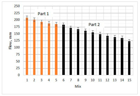 In its fresh state, the mortar’s flowability is the most important factor. To determine the flowability of mortar, the flow table test was utilized according to [30]. This involves placing the material in two layers and compacting it without segregation or bleeding. The flow values of various mixes are represented in Figure 2. Incorporating 15, 25, 35, and 50% lime as a partial replacement for cement significantly reduced the flowability of the cement-lime mortar. Also, a significant reduction was observed in mortar flowability when 25% lime was used as a partial replacement for cement and 10% to 100% granite powder was used as a partial replacement for fine aggregate. Figure 2, part 1 demonstrates a decline in the flowability of the cement–lime mortar as the replacement ratios of lime (15%, 25%, 35%, and 50%) for cement increase. Moreover, in Figure 2, part 2 of the mixtures, a consistent reduction in flowability is seen as the granite powder replacement ratios escalate in the presence of 25% lime. The data indicate that greater replacements lead to a significant decrease in flowability, due to elevated viscosity and cohesion in the mixture. This conduct is wholly consistent with the findings of [31].
