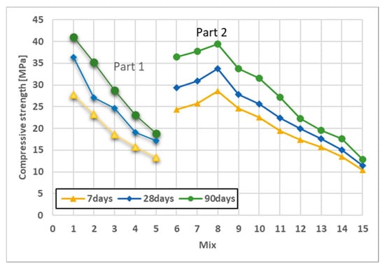 Compressive strength for various mixes at ages 7, 28, and 90 days.