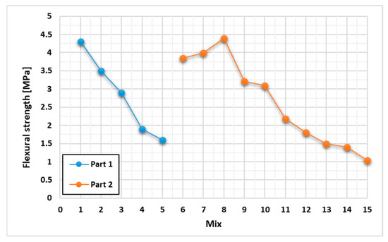 Figure 4 illustrates the flexural strength of mortars formed using a single binder over a 28-day period. In the initial segment, the cement mortar with the standard composition displayed the highest strength, followed by a notable reduction in strength as the proportion of lime increased. Specifically, mortars containing 15%, 25%, 35%, and 50% lime experienced a decline in flexural strength by 19%, 32%, 56%, and 63%, respectively. Comparable results can be found in existing scientific literature concerning both hydrated lime and cement mortars [37,38].