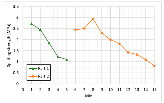 The tensile strength of concrete or mortar is closely related to its compressive strength. Analysis of the first part of Figure 5 shows that the splitting strength decreases significantly as the ratio of cement replacement lime increases. In the second half of Figure 5, mix no. 8 is 30% fine granite aggregate instead of fine aggregate, 25% lime as a partial replacement of cement, and 10% silica fume, at a constant water–cement ratio of 0.45. After that, the splitting strength was significantly reduced, which was due to the increased replacement of cement with lime.