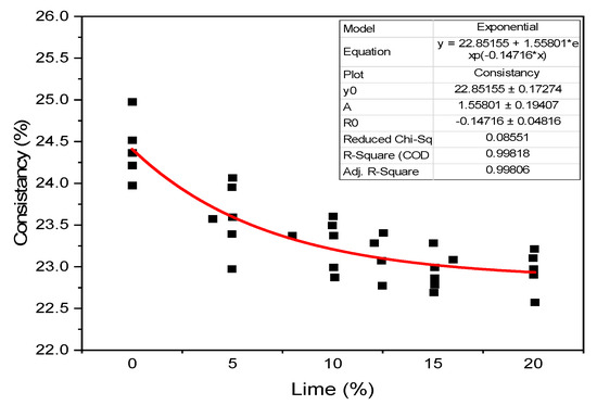 As the lime percentage rises, the fluidity of cement mortar tends to diminish. Lime decreases the consistency of cement. The Vipulanandan correlation model Equation (1) was used to forecast the consistency of the cement–lime mixture. The model parameters, together with an R2 value of 0.998, are shown in Figure 6. Figure 6 demonstrates that the addition of 20% lime resulted in a 6% decrease in the consistency of the cement.