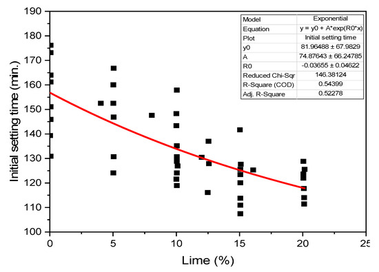 The presence of lime was discovered to expedite both the initial and final settling period of cement. The Vipulanandan correlation model Equation (2) was used to forecast the fluctuation in the initial and final setting time of modified cement–lime mortar. The model parameters included the coefficient of determination R2 = 0.54399. The addition of 20% lime resulted in a decrease of 27% in the initial setting times, respectively, as seen in Figure 7. The decrease in hydration rate of C-S-H cement may be attributed to the function of lime as a C-S-H nucleation substrate. In addition, the presence of a crystalline core in lime may have had a role in speeding up the early-stage hydration of tricalcium silicate (C3S).