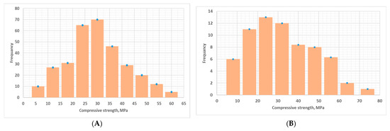 Normal distribution of compressive strength for (A) cement mortar and (B) modified cement-lime mortar.