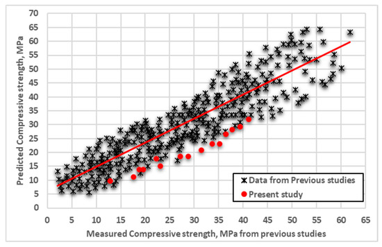 Measured vs. predicted compressive strength of modified cement-lime mortar.