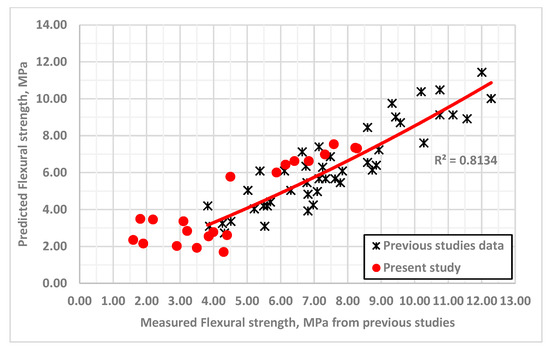 Measured vs. predicted flexural strength of modified cement–lime mortar.