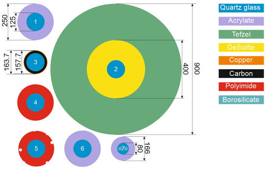As almost all the FUTs are made from the same type of glass and have similar glass cladding diameters, coating differences are the primary distinguishing factor. So, the influence of the glass core and cladding on the Young’s modulus was not considered in the study, since it was the same for all FUTs except “Fiber 7”. In summary, this approach to glass cladding and multilayer coatings has significantly simplified theoretical estimations. Its influence on the results was considered to be acceptable and is discussed in Section 4.