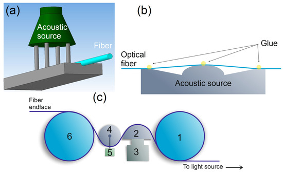 A 2 m segment of the FUT was fusion-spliced to a 440 m coil 1 of Corning SMF-28 fiber to ensure that acoustic perturbations occurred far from any reflective distortions at the input face. This configuration also ensured minimal transmission losses, enabling equal probing for all FUTs. The segment was then passed through half-pulley 2, with a flat face firmly attached to sound source 3, ensuring a uniform distance between the FUT and the sound source across samples, and minimizing acoustic wave losses by using a solid medium rather than air. Next, the FUT segment was placed under pulley 4 with a 60 g load 5. The load was selected to apply sufficient tension to the FUT without introducing additional probing light losses, thereby providing consistent and reproducible tension across all FUTs. Finally, the segment was fusion-spliced to another coil 6 of 412 m of Corning SMF-28, ensuring a sufficient distance between the end-face reflection disturbance and the acoustic event.