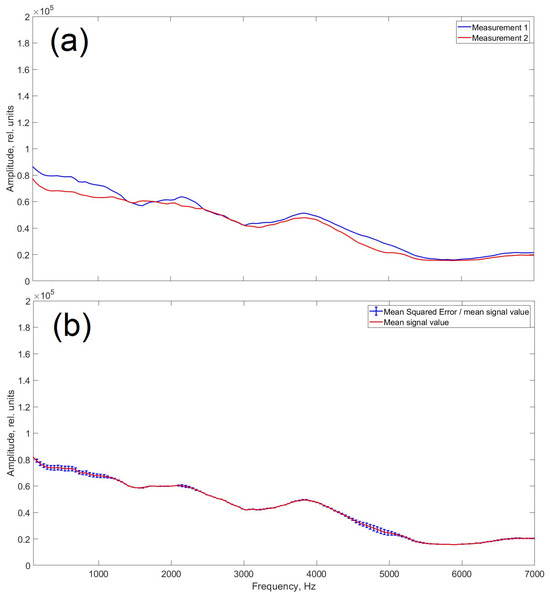 (a) Results of two consecutive measurements for the same FUT, showing consistency in the detected signal; (b) error bars for these curves, indicating measurement variability and reliability.