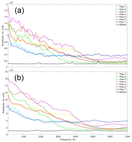 Testing began with “Fiber 1”, which was installed in the setup, and measurements were conducted with the speaker emitting the wideband signal described earlier, followed by a “silence” measurement with the speaker off to capture background noise. Each subsequent fiber segment was installed and measured with the speaker on. The results are presented in Figure 7. To enhance clarity, moving averaging with a 5-point window was applied to the curves in Figure 7b. Thus, the averaging window was being translated along the frequency domain of the obtained frequency-dependent acoustic sensitivity for each FUT.
