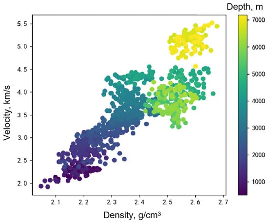 Based on the collected logging data, this study extracted and organized P wave velocity and density data at equivalent depths in the block, presenting them in a velocity–density cross-plot. The cross-plot shows the relationship between P wave velocity and density over the entire well depth, with each data point corresponding to specific values at certain depths. Detailed analysis of the cross-plot can extract important information about formation properties, especially the mechanisms behind abnormal formation pressures. In the plot, normal formations typically exhibit a linear trend representing the relationship between porosity and mineral composition. However, any anomalies deviating from this trend may indicate abnormal formations. The velocity–density cross-plot’s variations over the entire well depth are shown in Figure 1.
