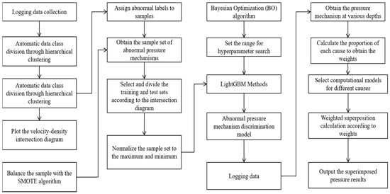 Currently, in the process of identifying the causes of abnormal formation pressure using velocity–density cross-plots, the causes of abnormal pressure mechanisms often require manual analysis and interpretation, which is time-consuming and difficult to quantify accurately. Because of this, the introduction of machine learning can greatly improve efficiency and accuracy. The process of establishing a method for identifying the causes of abnormal formation pressure based on artificial intelligence algorithms is shown in Figure 2.