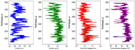 Utilizing well logging data, we extracted and calculated essential parameters, including effective well depth, sonic velocity, density, resistivity, and natural gamma radiation. A detailed analysis of the sonic velocity as a function of depth was conducted to identify the location of the normally compacted section, which is determined to be situated at depths exceeding 1300 m. The corresponding data for this normally compacted section are presented in Figure 7. Subsequently, this dataset was employed to establish the Gardner correction equation, facilitating the derivation of the normal trend line for the velocity–density relationship. This trend line serves as a critical reference point for identifying and analyzing abnormal pressures in the subsequent stages of the study.