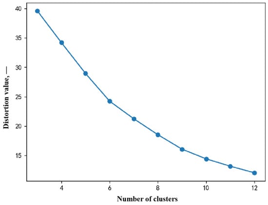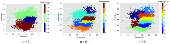 Using hierarchical clustering algorithms to cluster data, determining the number of clusters in the clustering algorithm before clustering is a crucial step, which directly affects the quality and application effect of the final clustering results. This paper combines the elbow method and silhouette method to determine the optimal number of clusters. Figure 8 is the elbow method graph, which plots the distortion values corresponding to each number of clusters. The number of clusters is on the X axis, and the distortion values are on the Y axis. By observing the shape of the elbow graph, the elbow point usually refers to the position where the curve changes sharply at an inflection point. The number of clusters corresponding to the elbow point is generally considered to be the optimal number of clusters. According to the elbow method graph, the optimal number of clusters is n = 6. On the basis of the elbow method, clustering results under different numbers of clusters are compared. When n = 6, hierarchical clustering identifies clusters that conform to the pressure recognition mechanism, and the classification effect on the dataset is more obvious. Some clustering results under different numbers of clusters are shown in Figure 9.
