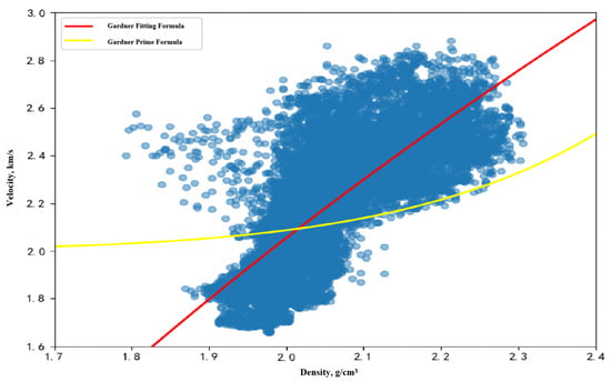To accurately divide the clustering results of different abnormal pressure mechanisms, a normal compaction trend line is drawn using the Gardner correction equation established by the data from the normal compaction section. The Gardner empirical formula is a method that reveals the relationship between formation density and P wave velocity, and there is often a certain error when directly using the Gardner formula to research velocity–density relationships. Therefore, based on the Gardner formula, the Gardner correction equation is obtained by fitting the normal compaction section data from the #A well and #B well in Cameroon. The Gardner correction equation fitted based on the normal compaction section data is shown in Figure 10.