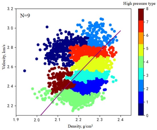 To further study the mechanisms causing abnormal high pressure, the key geophysical parameters of velocity and density are utilized. By applying clustering algorithms for unsupervised learning, the abnormal high-pressure mechanisms are divided into different groups, as illustrated in Figure 3. The advantage of this method is that it can automatically cluster similar data samples together without prior knowledge of specific categories.