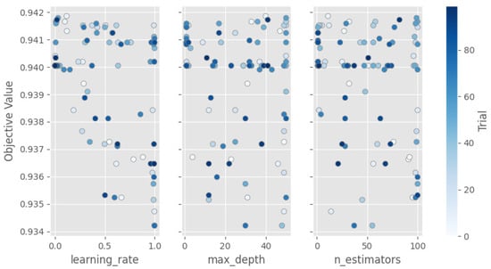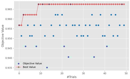 The search and optimization process of the Bayesian optimization algorithm is shown in Figure 12 and Figure 13. Figure 12 is a slice graph of the parameter relationships in the model, representing the progress of different hyperparameters in multiple trials. The horizontal coordinates are the learning rate, tree depth, and tree number, three hyperparameters in the model, and the vertical coordinates are the target function values, representing the model accuracy, with the legend on the right representing the number of iterations; Figure 13 is a historical record graph of model hyperparameter optimization, representing the performance improvement process of the model in multiple iterations. The horizontal coordinate is the number of iterations, and the vertical coordinate is the target function value, representing the model accuracy, with the blue point representing the current iteration accuracy and the red point representing the historical best accuracy.