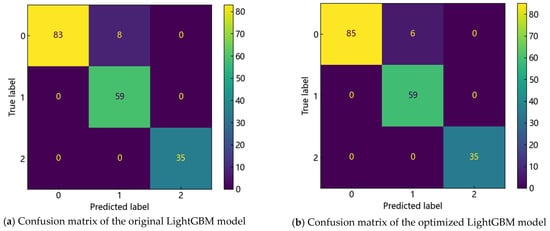 After comparative testing, the original LightGBM model has an accuracy rate of 0.906 on the test set. However, after model optimization using the Bayesian optimization algorithm, the new model achieved a higher accuracy rate on the same test set, reaching 0.942. This means that the new model is more accurate and reliable in identifying the mechanisms of abnormal pressure. Figure 14 is the confusion matrix of the results of the two models in identifying the abnormal pressure mechanism in the test set, used to evaluate the performance of the classification model. The horizontal and vertical axes represent the predicted values and true values of the model, respectively, with 0, 1, and 2 representing the abnormal pressure mechanisms of undercompaction, hydrothermal pressure increase, and shale diapirism, respectively. The color bar on the right explains the range of sample quantities corresponding to the color of each cell in the confusion matrix. It can be found that the optimized model is superior to the original model in the three abnormal pressure mechanisms, indicating that it is feasible to identify the mechanisms of abnormal pressure through machine learning.