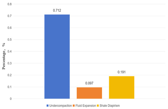 In the Rio Del Rey Basin, various mechanisms such as undercompaction, fluid expansion, and shale diapirism are superimposed and jointly affect the formation of abnormal high pressure. By calculating the weights of the high-pressure mechanism categories at different well depths in the high-pressure layer segments of the #A well, #B well, and BRM1 well in the Rio Del Rey Basin, the relative importance of each mechanism in the formation of abnormal high pressure can be determined. The experimental results show that undercompaction is the dominant mechanism for abnormal high pressure in the Rio Del Rey Basin, accounting for about 70%, while fluid expansion and shale diapirism account for 10% and 20%, respectively. The proportion of each mechanism is shown in Figure 15. This means that in this area, undercompaction is the main factor causing abnormal high pressure, and the tectonic compression caused by shale diapirism and the fluid expansion caused by hydrothermal pressure increase further promote the increase in pore fluid pressure in the strata. This finding is of great significance for a deeper understanding of the geological pressure characteristics and sedimentary action in this area. Through the weight analysis of these mechanisms, the formation process of abnormal high pressure can be more accurately predicted and explained, providing strong support for geological research and engineering applications.