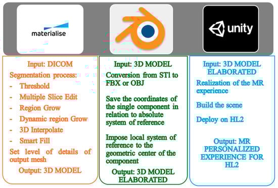 Workflow of the methodology presented and the software used in each step from the segmentation of the DICOM images in Materialise, the elaboration of the 3D model in Blender, and the realization of the MR experience for HL2 in the Unity engine.