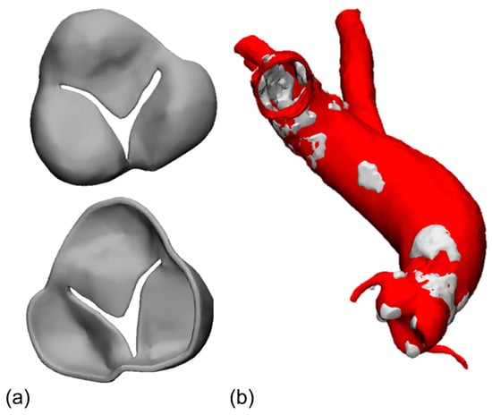 (a) 3D model of the valve manually segmented; (b) valve and aorta with integrated manually segmented calcifications.