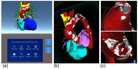 Screenshot of the user’s view while using the MR application on HoloLens: (a) initial scene of the MR app with the holographic menu; (b) only the parts of the heart selected by the user are shown, and a semi-transparent plane, manipulated by the user, sections them; (c) two different points of view of the inside of the aorta presented through the hologram.