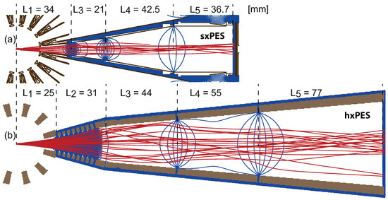 The operation principle of the PES is that atoms in a low-density matter target are ionized whereupon photoelectrons are emitted with a kinetic energy () that is proportional to the photon energy () according to the photoelectric effect, where , is the binding energy of the electron before its emission. Flight tubes with an applied retardation voltage act as dispersive elements where the time is measured from the instant of ionization until electrons reach a microchannel plate-based detector. Data acquisition is performed with digitizer boards (Teledyne SP Devices ADQ 412-4G) in a TCA crate. The boards can be operated either in four-channel mode with 2 GS ( ns binning), or optionally, two channels can be bridged in order to increase the sample rate to 4 GS ( ns binning). The dynamic range is ±400 mV. A fluxgate-type magnetometer is mounted near the source region. A three-axis Helmholtz coil structure surrounds the device to compensate for the background magnetic field, which would otherwise affect the electron trajectories. The design was imported into the commercial software Simion 8.2 to optimize the collection efficiency and resolving power for a range of electron kinetic energies spanning several keV [25]. Figure 1 shows simulated electron trajectories for (a) sxPES and (b) hxPES.