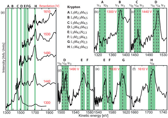 (a) Krypton LMM and LMN Auger–Meitner lines measured with hxPES at . Retardation voltage was tuned in the range 1300 to 1610 V. The detector at 90° was used, and the digitizer was configured to 4 GS. The conversion to kinetic energy is made for each retardation voltage and is based on numerical inversion of the analytical calibration using Equations (1)–(7). Panels (b–f) show expanded views of each band A–H. Dashed lines indicate final states.