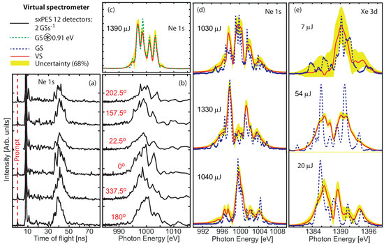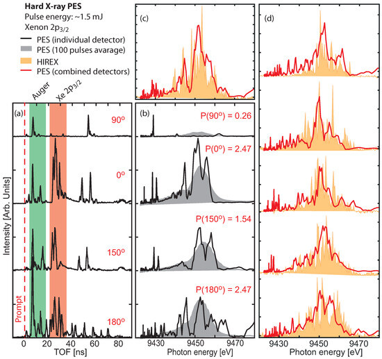 Figure 3 shows single-pulse spectra of Xenon 2 measured with the hxPES [16] at the SASE1 beamline. The undulator gap was tuned for 9450 eV radiation. Binding energy is [13] and natural line broadening is [36]. At this photon energy, the anisotropy parameter is [14] and the photoionization cross-section is [11]. Although the spectrometer has 12 flight tubes, it was equipped with only four detectors during these measurements. Now, two additional detectors have been assembled and installed on the device to improve the signal statistics. Figure 3a presents electron TOF spectra from one single photon pulse recorded with the four available detectors. The signal from scattered light defines a prompt that represents the instant of ionization subtracted by ns due to the time it takes photons to reach the detectors. The peaks in region – are related to valence photoelectrons and Auger–Meitner electrons where the high kinetic energy leads to short TOF. Around 30 ns, we see the Xe 2 photoelectrons that have been decelerated from very high kinetic energies, around 4660 eV, to only a few 10 eV. The retardation voltage was set to V. Figure 3b shows the Xe 2 spectra converted from TOF to spectral distribution according to our calibration function. The gray area plot shows the spectral distribution for an average of 100 pulses. As is expected from the polarization function, Equation (8), for linear horizontal polarization and a positive anisotropy parameter, the intensity reaches a maximum at 0° and 180°, and is decreased at 150°. The detector located at 90° provides only a minor contribution to the total intensity. The challenge in the hard X-ray regime, for single-pulse photon diagnostics, is the poor photoionization cross-section with the consequence that one detector alone does not provide sufficient statistics to represent the actual spectral distribution, and thus it is needed to combine the signals from several detectors. Figure 3c shows the sum of the four detectors (red line). As a means to validate the reliability of the photoelectron spectrum and of the calibration, we compare with a spectrum measured for the same photon pulse by the downstream located HIREX (HIgh REsolution hard X-ray) spectrometer [7]. This is a single-shot spectrometer, based on a bent crystal as a dispersive element, and a MHz-repetition rate strip detector. Optionally, an upstream diamond diffraction grating can be used in transmission to split off a small fraction (0.1%) of the photon beam for this analysis instead of using the zero-order direct beam which is propagated to and used at the experiment endstation. The HIREX and the hxPES are two complementary and independently calibrated devices for spectral diagnostics. At 9 keV, the HIREX offers a high spectral resolution of about eV, but in contrast to the PES, it is partially invasive and has a measurement rate of MHz limited by the currently used Gotthard-I detector, whereas the PES can provide diagnostics up to the maximum repetition rate of MHz available at European XFEL. Figure 3d shows five subsequent single-shot photon pulses measured with both the PES and the HIREX.