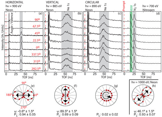 The detector and flight-tube performance is not identical; thus, the peak intensity must be normalized, which is accomplished with Auger–Meitner lines whose polar and azimuth intensity distribution is nearly isotropic. In particular, the KVV transition energies in the range 357 eV to 367 eV are useful for this purpose [37]. Figure 4d presents electron TOF data for eight of the detectors from an target at eV with retardation voltage. The data are averaged over 20 pulses for reliable statistics. The intensity of the KVV peak at about 17 ns (shaded green area) is used to normalize the detector performance by calculating a calibration factor for each detector. In addition to the Auger–Meitner band, the 1s peak () is seen at about 27 ns. These data were collected with the helical undulator tuned to elliptical polarization, thus explaining the almost isotropic distribution of 1s photoelectrons. During this study, 14 out of the total 16 detectors were used. The intensity normalized Ne 1s peak in Figure 4a–c is integrated over the gray area and presented in polar coordinates in Figure 4e–g. Figure 4h shows the angular distribution with the helical undulator set to ° at 1000 eV taken at a different occasion with all 16 detectors active. The polarization function in Equation (8) was fitted to the data points from which we can extract and .