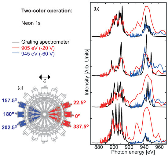 sxPES two-color operation with Ne 1s. (a) Flight tubes at 157.5°, 180° and 202.5° are set to for higher photon energy. Flight tubes at 22.5°, 0° and 337.5° are set to for lower photon energy. indicates the polarization vector. (b) Sum of single pulse spectral distribution registered at the two detector groups with undulator sections tuned to 945 eV and 905 eV, respectively. This data set was collected in single-bunch mode, which enables us to compare the spectra with the GS for both colors.