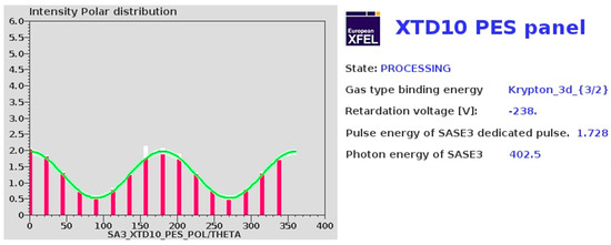The device also provides online polarimetry diagnostics by fitting the peak intensity from each of the detectors to Equation (8) and presenting the fitting parameters and . In the case of polarimetry, s-orbitals () are preferable since higher anisotropy means more accurate fitting. In photon energy regions where s-orbitals are unavailable for reasons such as very poor or overlap with Auger–Meitner lines, p- or d-orbitals must be used where varies with photon energy. This is in particular relevant below 1s at 410 eV. To perform polarimetery in those regions, while tuning the undulator, the monitoring software device must continuously update the anisotropy parameter from a library file by using feedback from the target gas and the calibrated photon energy. Figure 7 presents the DOOCS panel for online polarization monitoring averaged over 10 pulses for better statistics. The target gas is Krypton and the selected photoemission line is Kr 3d. 402.5 eV corresponds to [12]. Pink bars indicate the integrated intensity over each of the 16 detectors. The green curve is the fitted Equation (8). Polarization is linear horizontal, and fitting gives and .