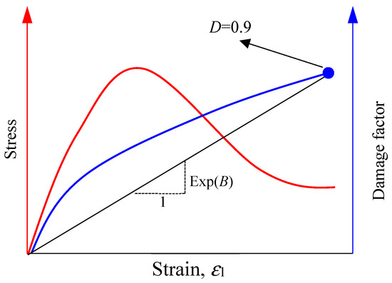 Generally, the damage variable (D) ranges from 0 to 1, but it cannot reach 1 due to residual strength and other factors. Previous studies have shown that the damage variable reaches approximately 0.9 when the rock is destroyed [24]. D is taken as 0.9 in this paper. At a damage variable of 0.9, the physical interpretation of Equation (12) is shown in Figure 1. This indicates that the faster damage development corresponds to a more brittle rock. Incorporating Equations (9) and (10) into Equation (12), the following formula is derived: