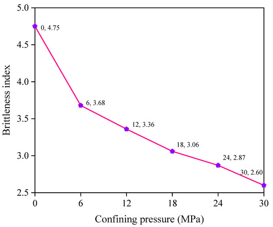 The triaxial compression test is an essential approach to investigate the mechanical behaviour of rocks. Over the years, numerous triaxial compression tests have been conducted [27,28,29], revealing that rock brittleness is significantly affected by confining pressure. The deformation behaviour of rocks changes from brittleness to ductility with the increment of confining pressure. We utilized triaxial compression test data of coal obtained by Zhang et al. [30] to verify Equation (15). Table 1 shows the calculated parameters (peak strain, peak strength, Poisson’s ratio and elastic modulus) for various circumferential pressures (0, 6, 12, 18, 24 and 30 MPa). Note that the selection of Poisson’s ratio refers to Gao, Stead and Kang [26]. Based on Table 1, Figure 2 displays the brittleness index of coal obtained by Equation (15). As the confining pressure rises from a zero-stress level to 30 MPa, the brittleness index declines from 4.75 to 2.60, which indicates that the defined brittleness index validly identifies the influence of confining pressure on brittleness characteristics. The results acquired from our proposed index are consistent with an energy-based indicator proposed by Zhang et al. [30].
