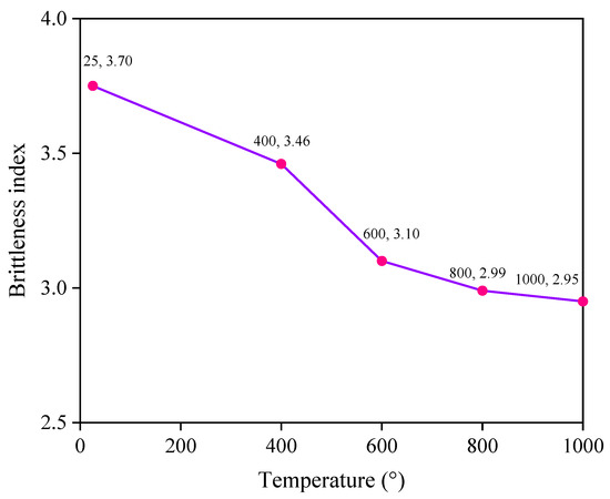 Triaxial compression tests have shown that temperature poses an obvious effect on rock brittleness. The properties of rocks shift from brittleness to ductility with the increasing temperature. To further validate Equation (15), we referred to triaxial compression test data conducted by Wei et al. [31] on sandstone under a constant confining pressure of 10 MPa. For different temperature conditions (25, 400, 600, 800 and 1000 °C), the mechanical parameters were calculated, including peak strain, peak strength, Poisson’s ratio and elastic modulus, as listed in Table 2. Using Equation (15), the sandstone brittleness index is shown in Figure 3, which decreases from 3.70 to 2.95 as the temperature grows from 25 to 1000 °C. This result confirms that the proposed index accurately captures the impact of temperature on rock brittleness characteristics. Our findings are consistent with an index proposed by Wang et al. [4].