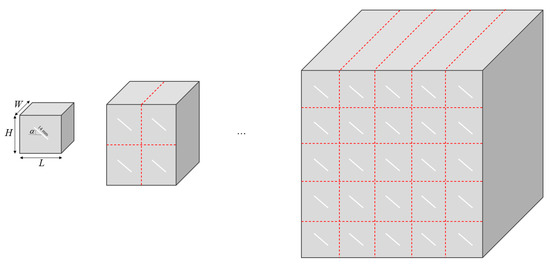 Figure 4 displays the test specimens. Note that L, H and W symbolize the length, height and width of the specimens, respectively, and α denotes the dip angle of the joints. We prepared the specimens using comparable materials (silicate cement, pure water and fine sand in a ratio of 2:1:2). Given the practical constraints of laboratory tests, we neglected the boundary effects of the joints. To simulate the intermittent joints typically encountered in real-world conditions, we combined the smallest specimens of the test design in equal ratios to create larger specimens for assessing the influence of size on rock properties.