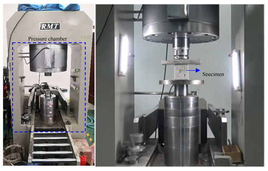 For the test, we examined a total of 20 groups, with three specimens in each group, using four joint dip angles (α = 0°, 30°, 60° and 90°) and five model sizes (L = 40, 80, 120, 160 and 200 mm). Table 3 illustrates the testing protocol. We employed a rock mechanics rigid servo testing machine (model: RMT-150C) manufactured by the Chinese Academy of Sciences (Beijing, China), to conduct the laboratory experiments. The tests were performed using a constant displacement-controlled loading of 0.005 mm/s. The test equipment and loading diagram are shown in Figure 5.