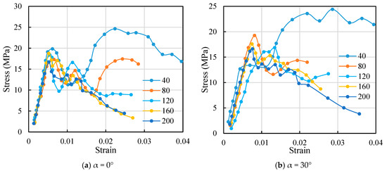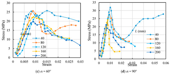 A representative relationship between stress and strain is illustrated in Figure 6. The deformation process of the jointed specimens under all conditions is similar to intact rock specimens and it includes the crack closure phase, elastic deformation phase, crack growth phase and post-peak phase. Unlike intact rock, the jointed specimens may exhibit “multi-peak” characteristics in their deformation curves due to the presence of joints.