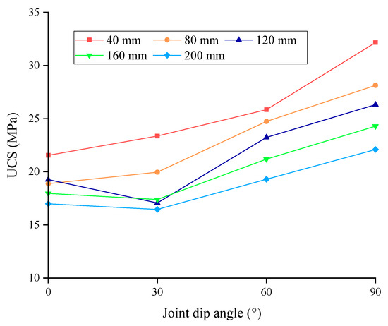 The uniaxial compression strength (UCS) is an indispensable strength indicator of the rock mass. The UCS values of jointed specimens present an overall V-shaped distribution with the increasing joint dip angle (Figure 7). Specifically, the UCS value originally declines and then grows as the dip angle of joints increases. This conclusion agrees with the law obtained from the existing compression experiments of joints [34,35]. Generally, the UCS values of the rock mass decline with the growth in the model size, which indicates an obvious size effect.