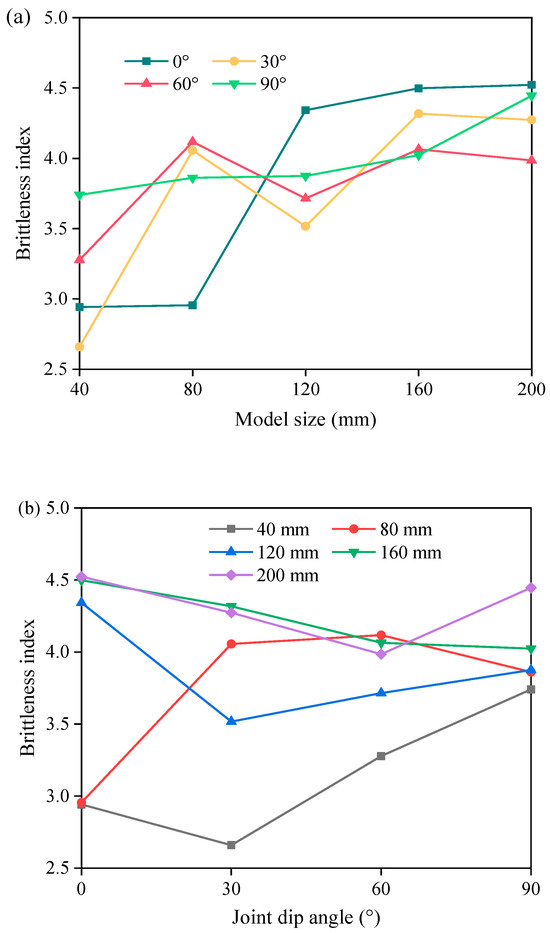 This study quantitatively analyzed the influence of joint dip angle and model size on the brittleness features of the specimens using Equation (15). Figure 8a shows changes in the brittleness index of the specimens concerning the model size. The brittleness index displays a monotonic increasing pattern as the model size increases when the joint dip angle is constant at 0°. As the dip angle of the joints increases to 30°, the specimen gradually shifts from plasticity to brittleness with the growth in model size. Similarly, as for the joint dip angle of 60°, the brittleness of the specimen maintains an upward tendency with the model size. When the joint dip angle reaches 90°, the brittleness index rises from 3.74 to 4.45 with the increasing model size. Among these four joint dip angles, the least significant impact of model size on the specimen brittleness is found in the case where the joint dip angle is 60°.