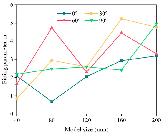Figure 9 and Figure 10 illustrate the relationships between the two fitting parameters (m and F) and the model size (L) and joint dip angle (α). The parameter m generally increases with the model size, while it shows a trend of first increasing and then declining as the joint dip angle grows. Previous research has demonstrated that the parameter m refers to a shape parameter related to the shape of the post-peak stress–strain curve [15]. The larger the value of m, the more brittle the material. This result aligns with the overall results of the proposed index and offers further confirmation supporting the proposed index’s soundness. In contrast, the parameter F tends to decrease as the model size increases and there is no clear relationship with the joint dip angle.