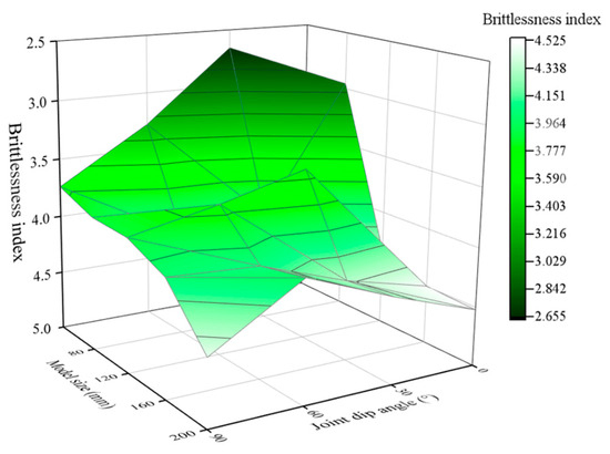 Previous research has emphasized the significance of model sizes and joint dip angles in determining the strength and deformation properties of rocks. Nonetheless, there are very few studies on how the brittleness of rock masses is influenced by model size and joint dip angle. To address this gap, we conducted uniaxial compression tests on rocks that considered both size effects and joint dip angle in our previous work [33]. Specifically, we examined the impact of these two factors on the brittle characteristics of rock masses using the proposed brittleness index (Equation (15).