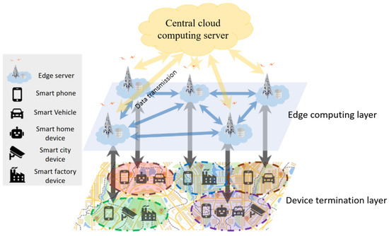 To overcome these challenges, edge computing has emerged as an innovative paradigm. Its fundamental principle is the strategic deployment of edge servers in proximity to the device nodes, enabling real-time data processing at the source [15,16]. Only complex computational tasks or critical data that cannot be efficiently processed at the edge are then transmitted to central cloud servers for further handling. As illustrated in Figure 1, because edge servers are geographically closer to the device nodes, they offer significant advantages, including enhanced bandwidth and reduced data transmission latency, in comparison to cloud servers. By distributing the computational workload between edge and cloud servers, this hybrid approach optimizes the system’s overall efficiency, scalability, and reliability. The edge servers effectively reduce the computational and storage load on the central cloud servers, thereby enhancing the system’s ability to handle the burgeoning demands of IoT applications in a more robust and sustainable manner [17,18,19,20,21].